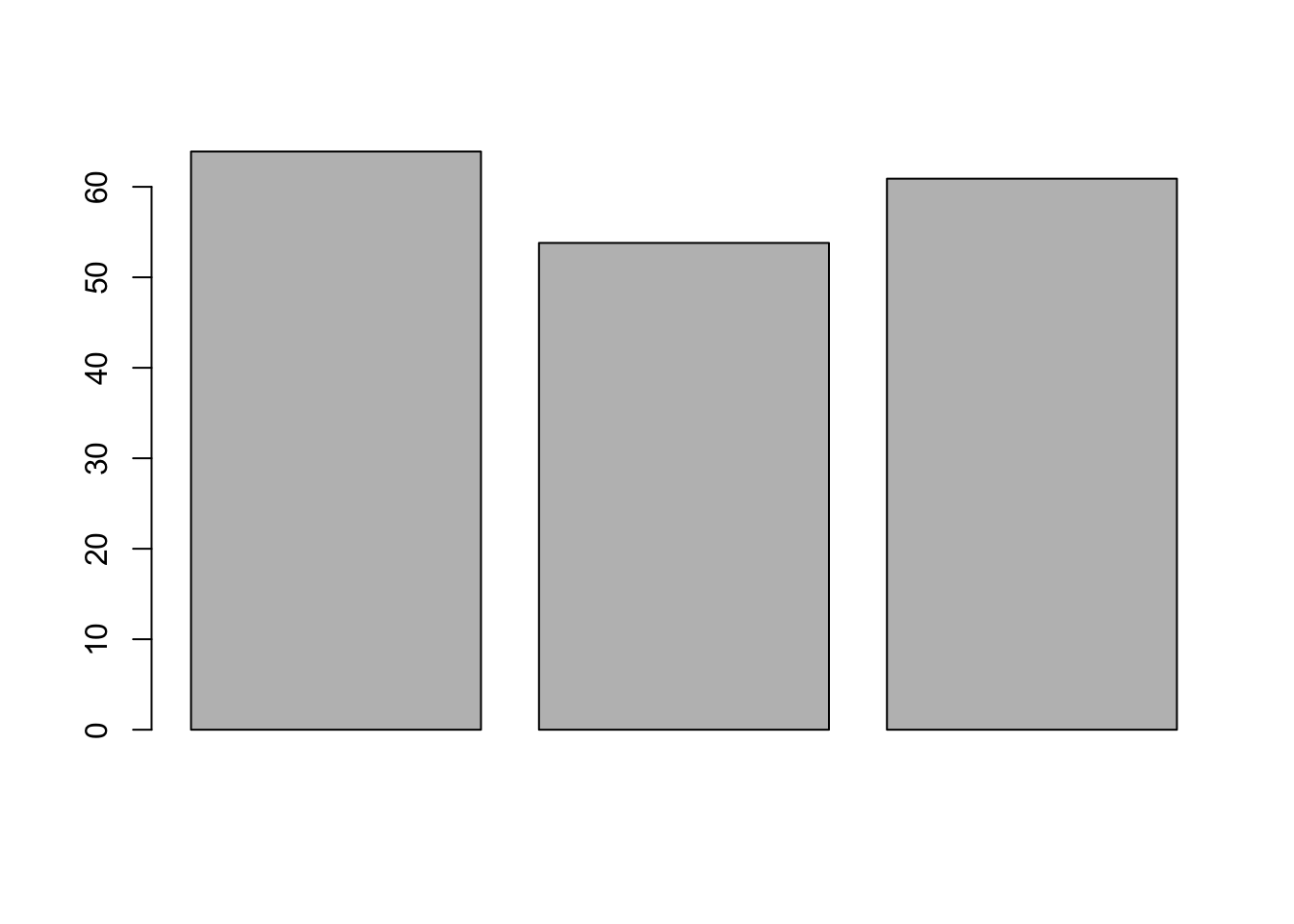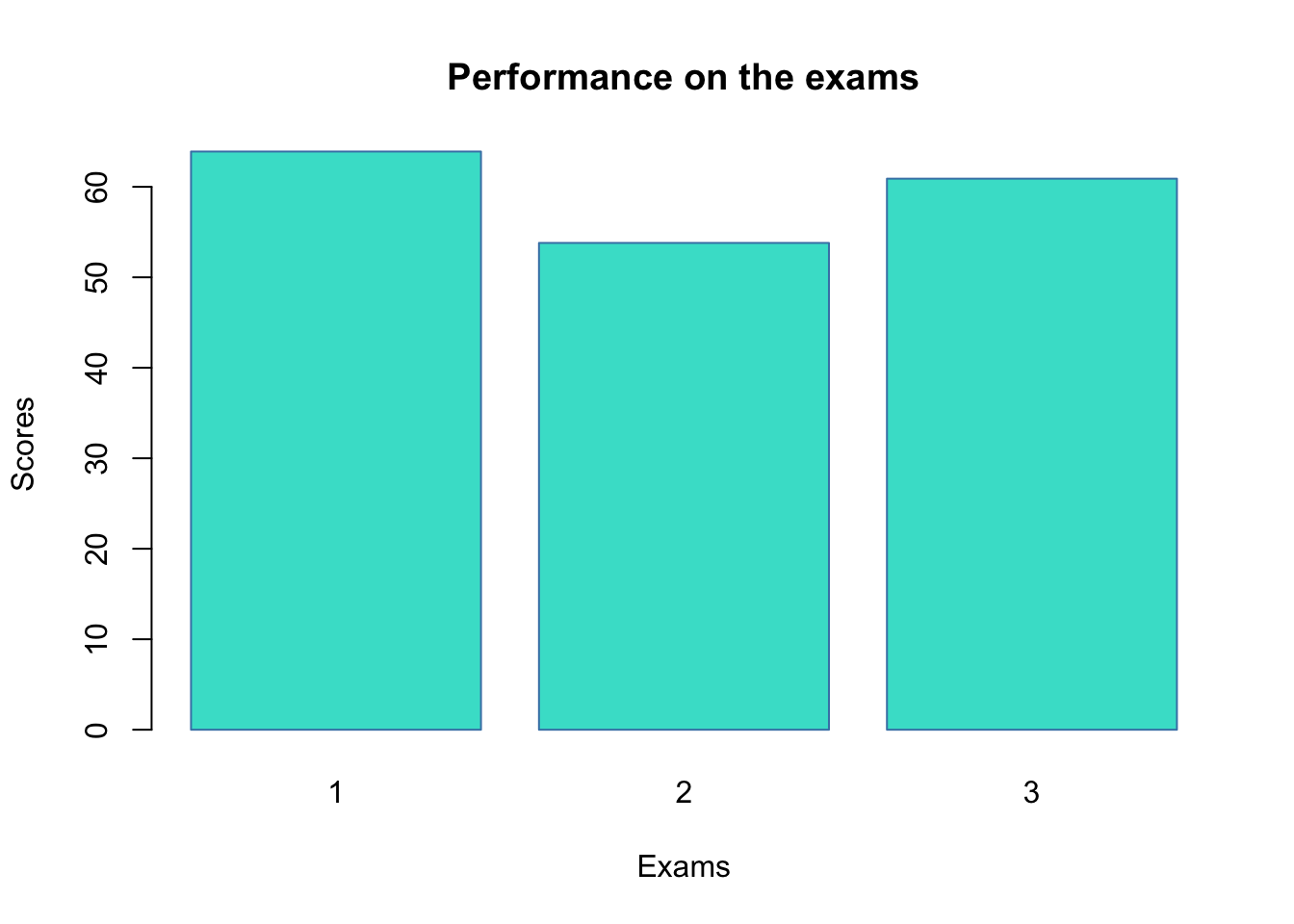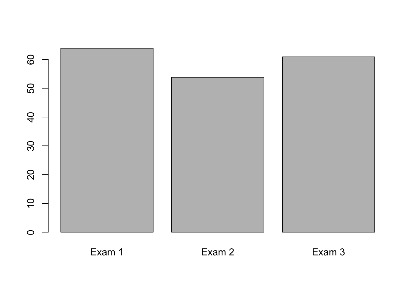 barplot(mean_scores, names.arg = c("Exam 1", "Exam 2", "Exam 3"))