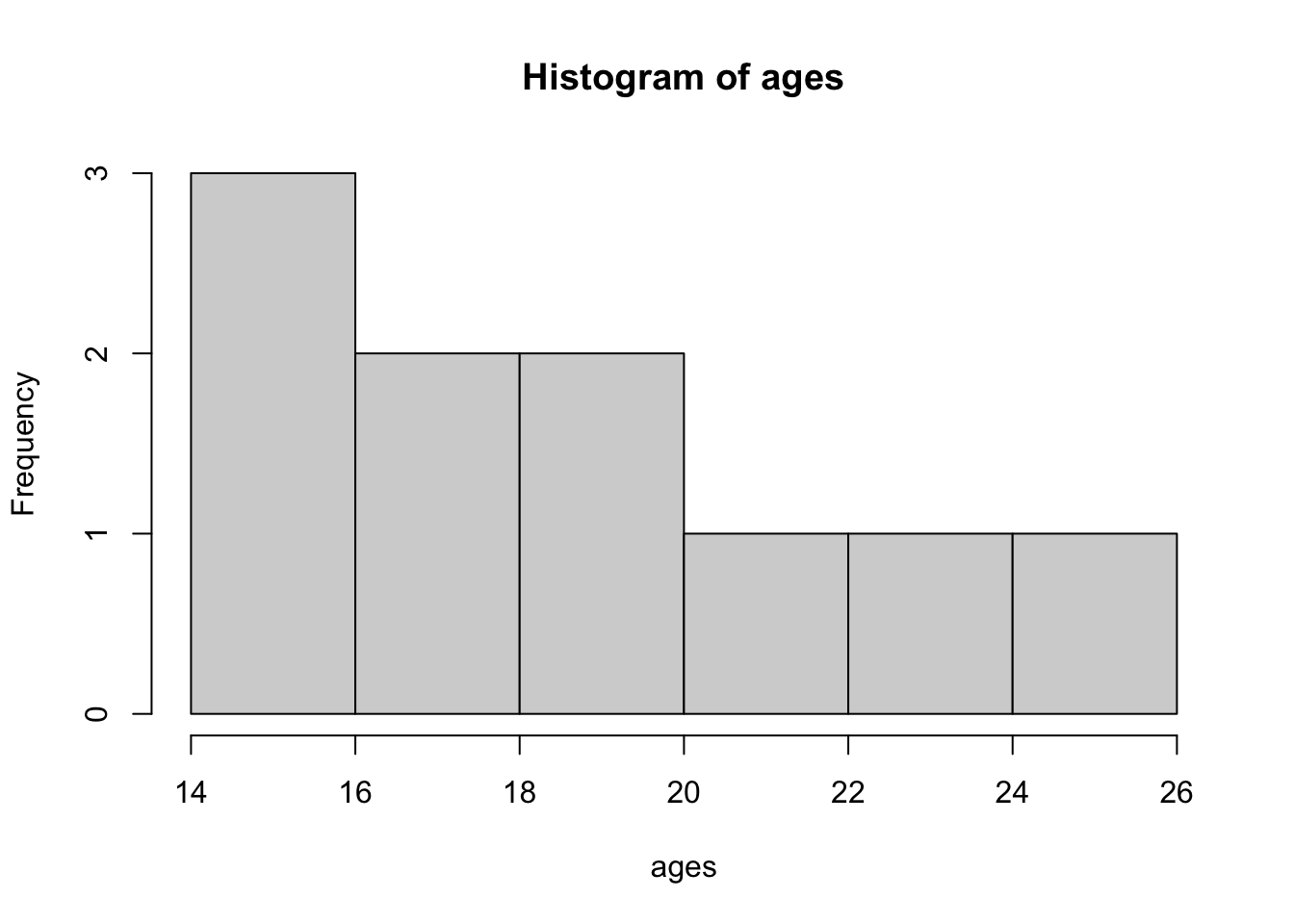 ages <- language_exams$ageA histogram can be created using the hist() function. This plots the frequency of the variable ages in the our language exams dataset. You can play with colours if you want here, it’s the same as with barplot