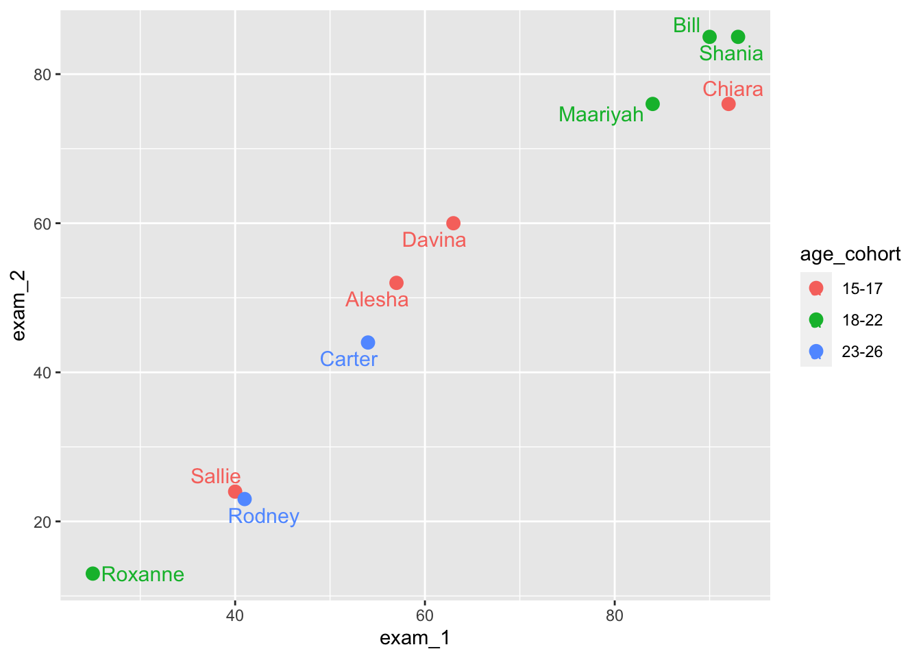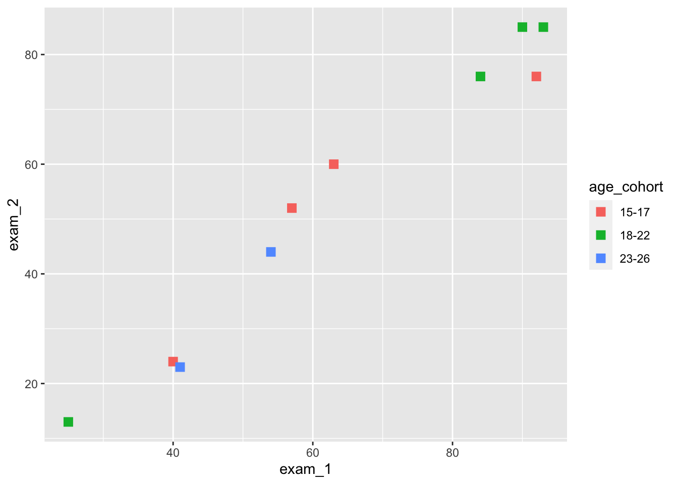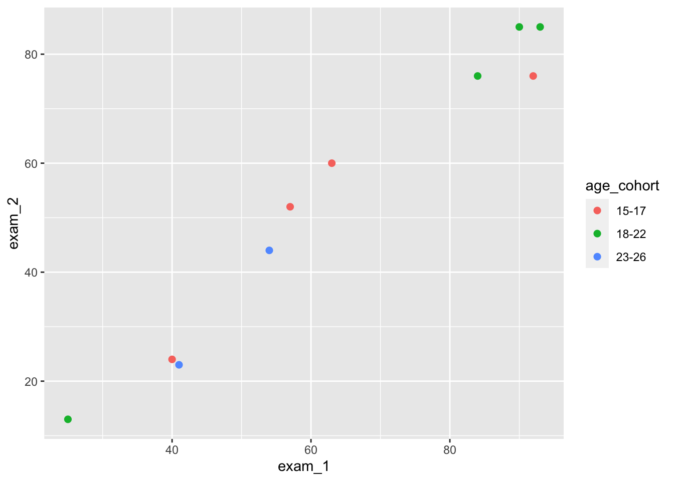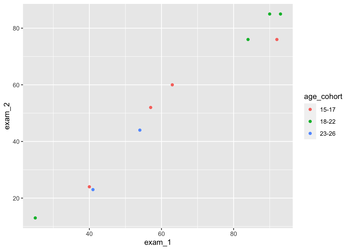 ggplot(aes(x = exam_1, y = exam_2, color = age_cohort)) +