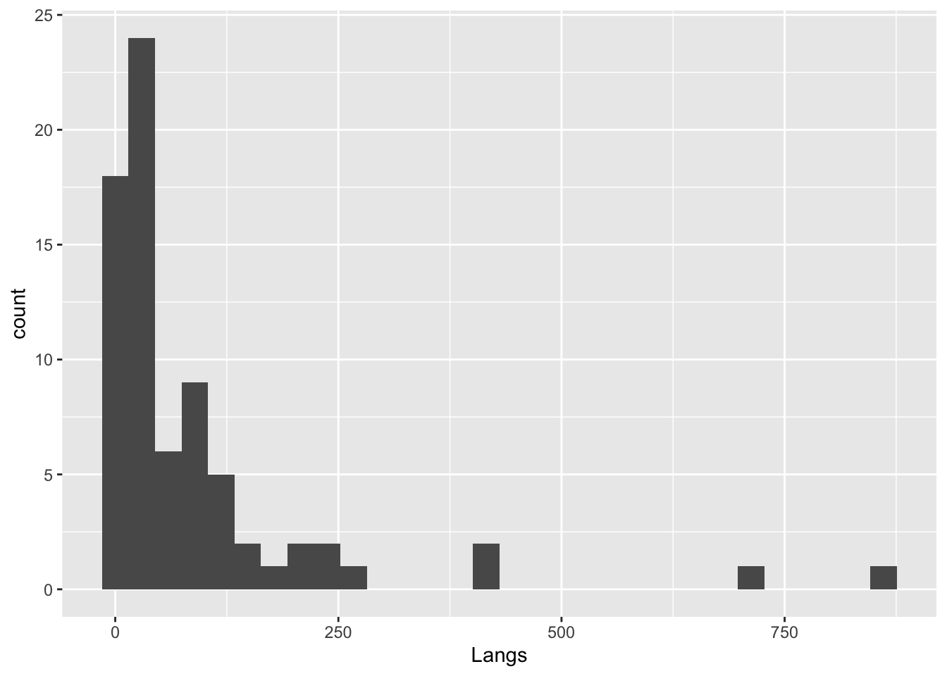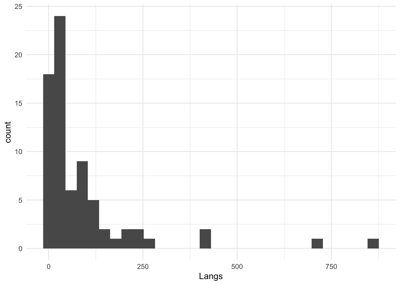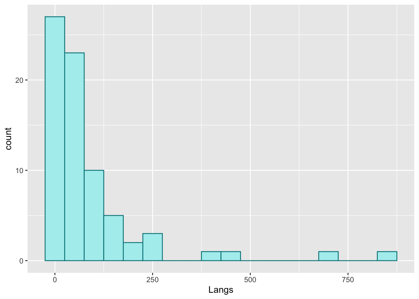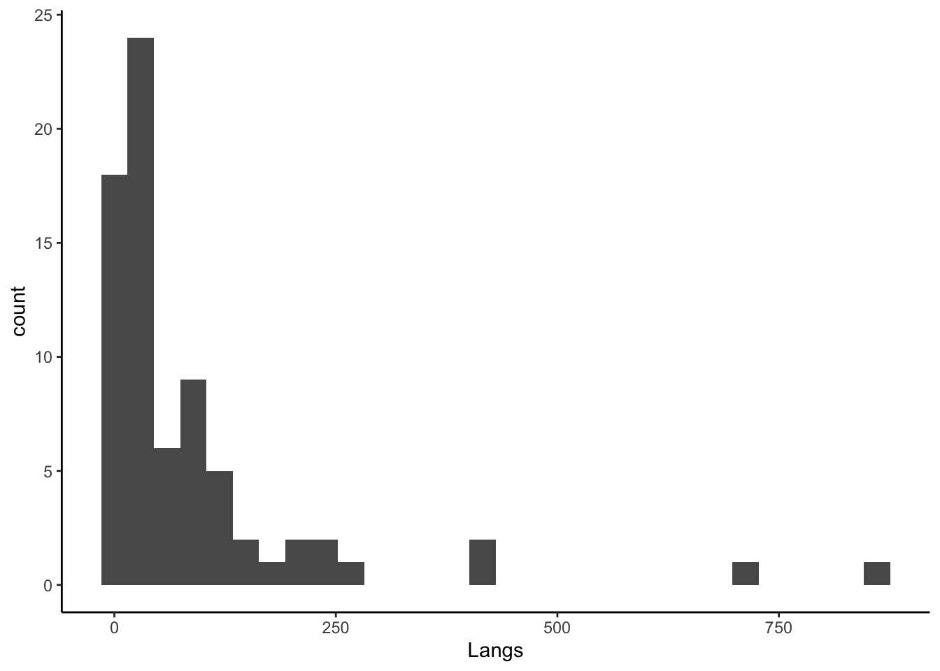 Let’s now turn to scatterplots. Again, let’s some data, this time the Nettle (1999) data about language diversity, used in Winter (2019).