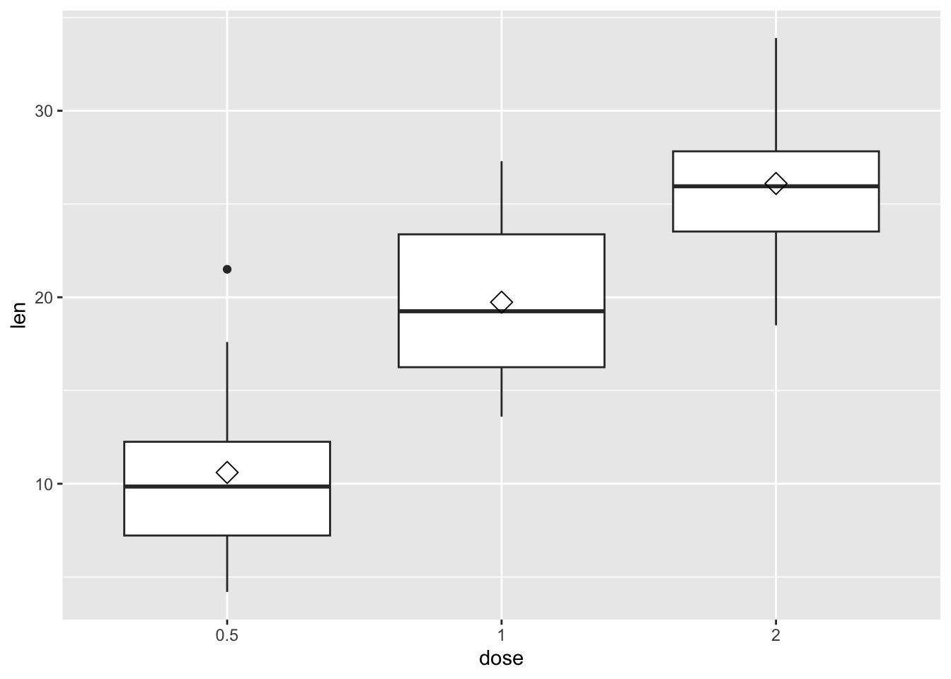 The function stat_summary() can be used to add mean points to a box plot, as in the following command.