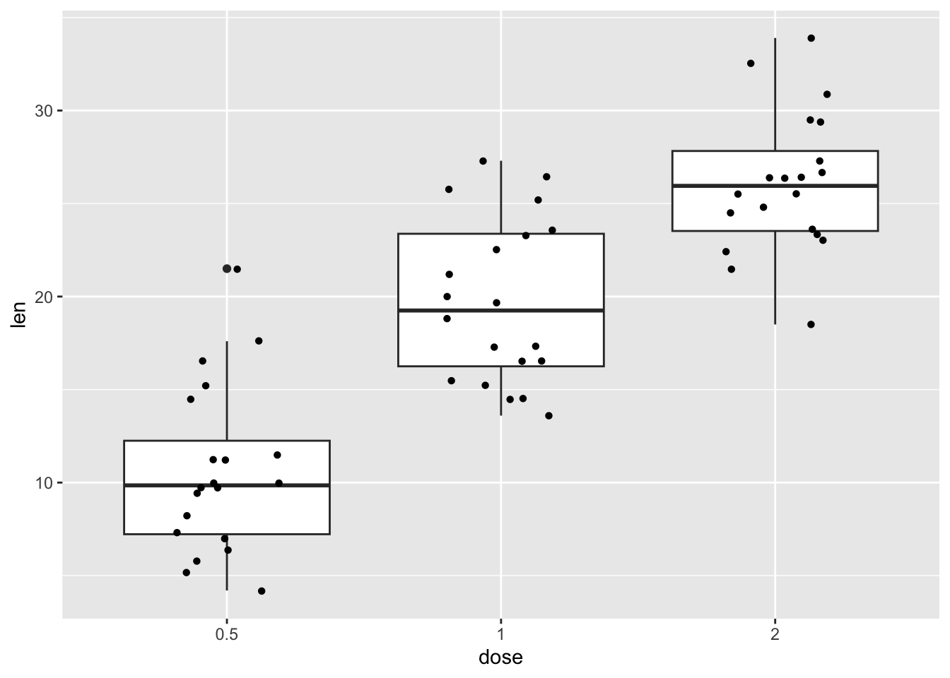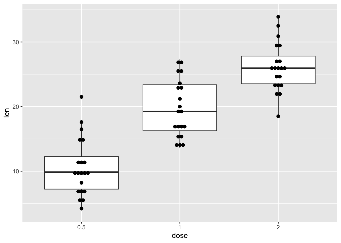 We can add points to a box plot by using the functions geom_dotplot() or geom_jitter().