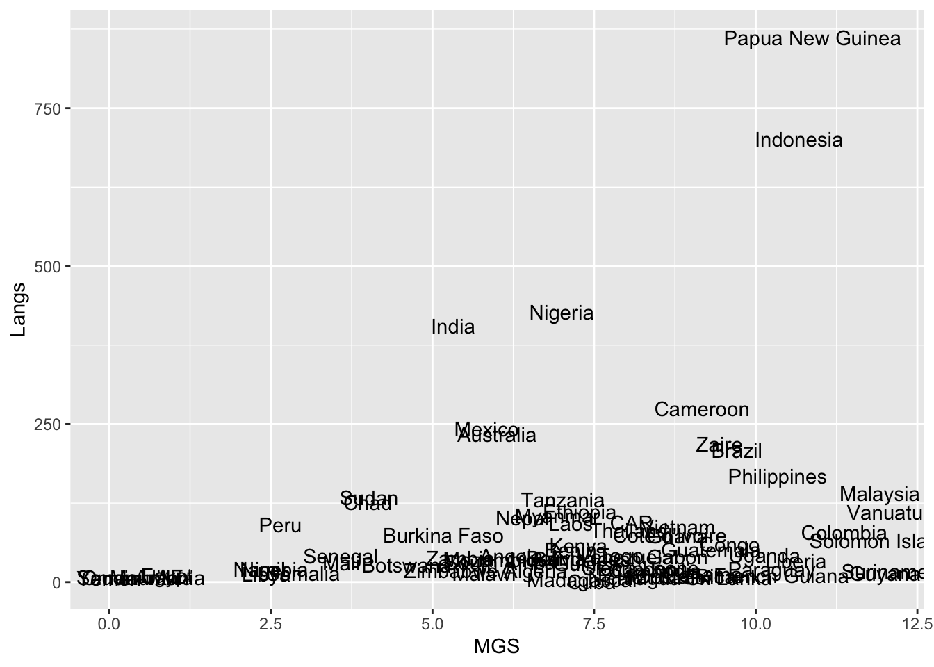 ggplot(languages, aes(MGS, Langs, label = Country)) + geom_text()