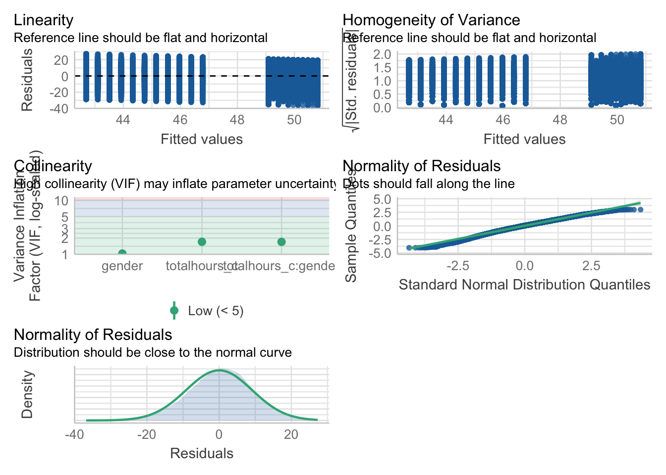 check_homogeneity(lm(wellbeing ~ totalhours_c * gender, data))Warning: Variances differ between groups (Bartlett Test, p = 0.000).