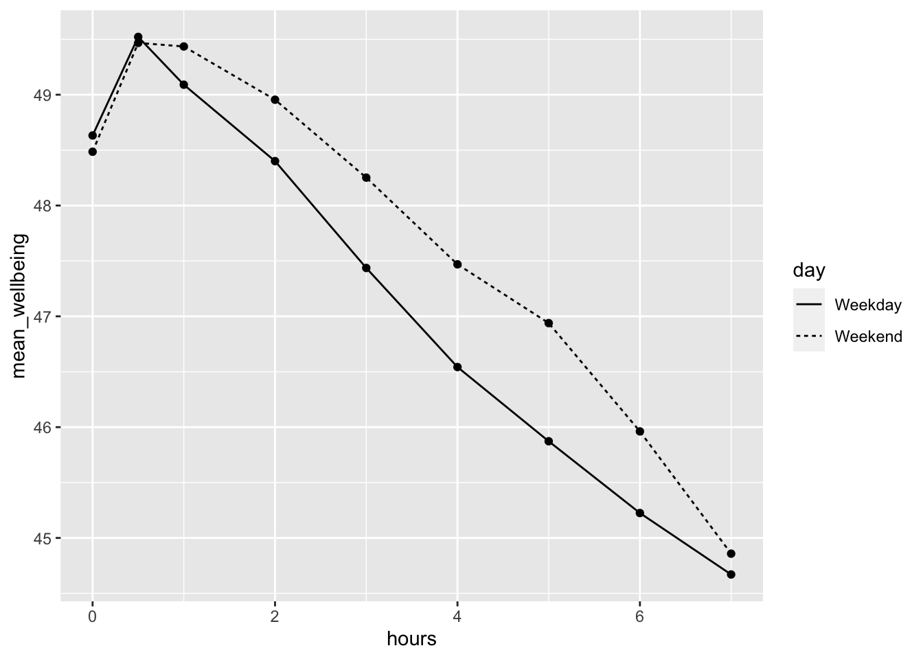 ggplot(aes(hours, mean_wellbeing, linetype = day)) +