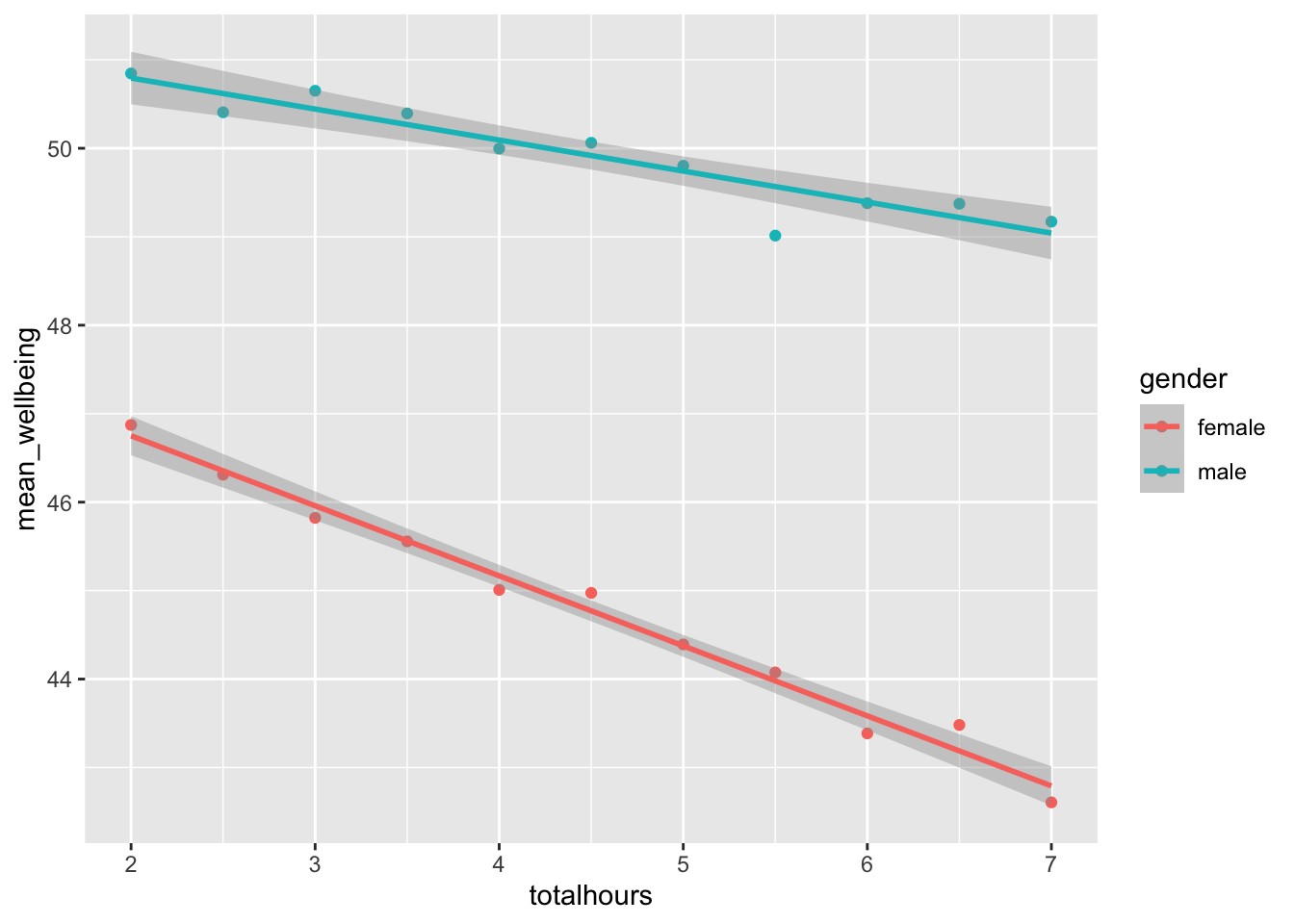ggplot(aes(totalhours, mean_wellbeing, colour = gender)) +