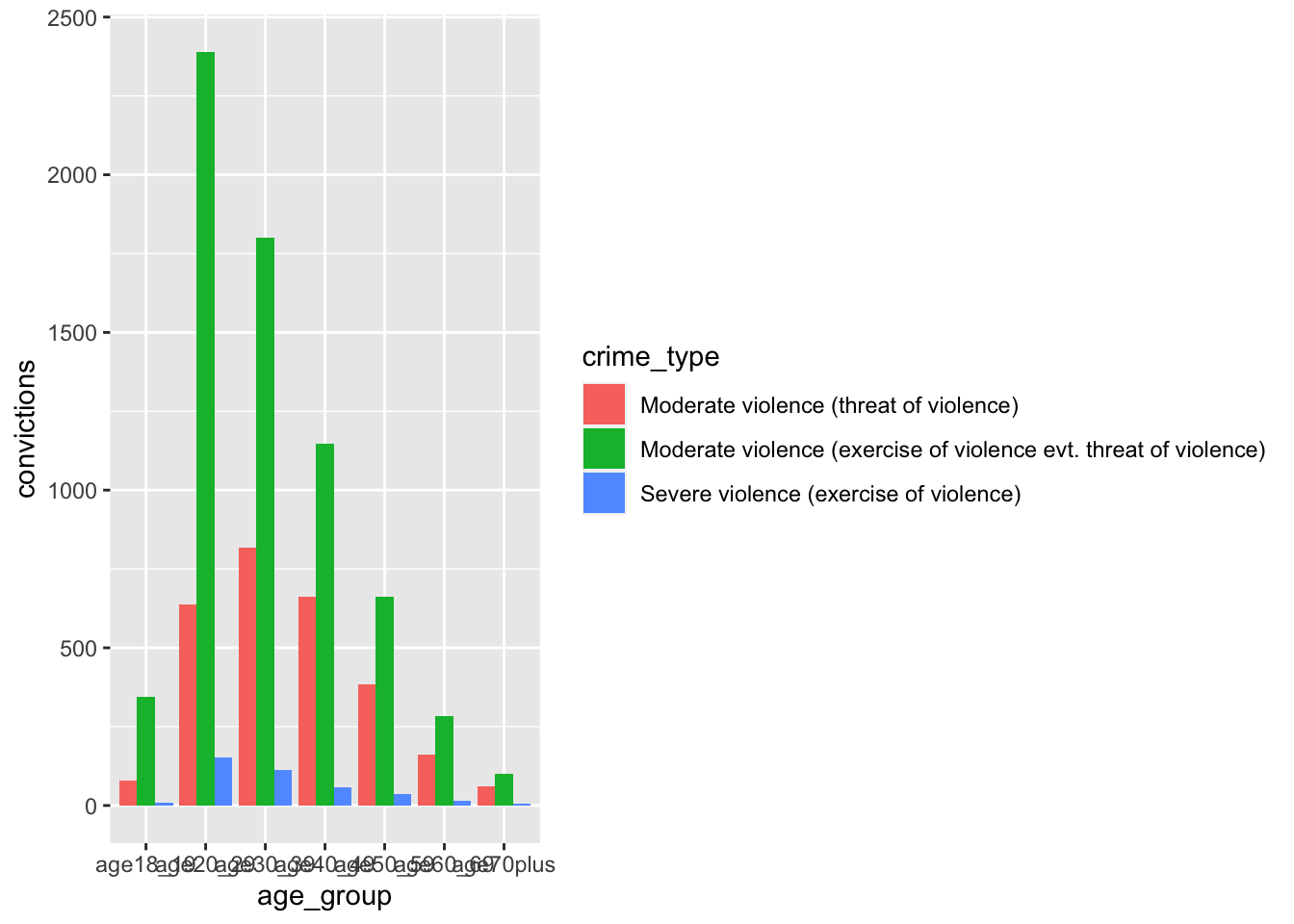 ggplot (aes (age_group, convictions, fill = crime_type)) +